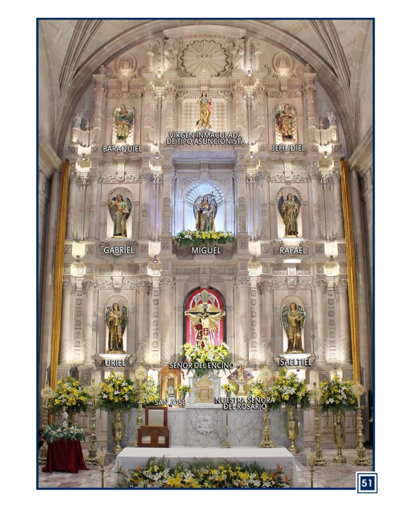 - Escultura central de San Miguel Arcángel, obra de Brígido Ibarra